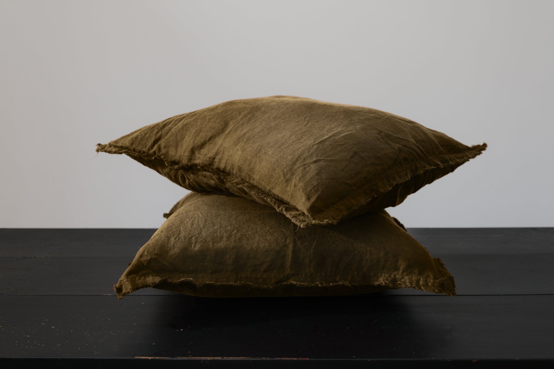 PAIRE DE TAIES D'OREILLER EN LIN EUROPÉEN EFFILOCHÉ À LA MAIN - OLIVE