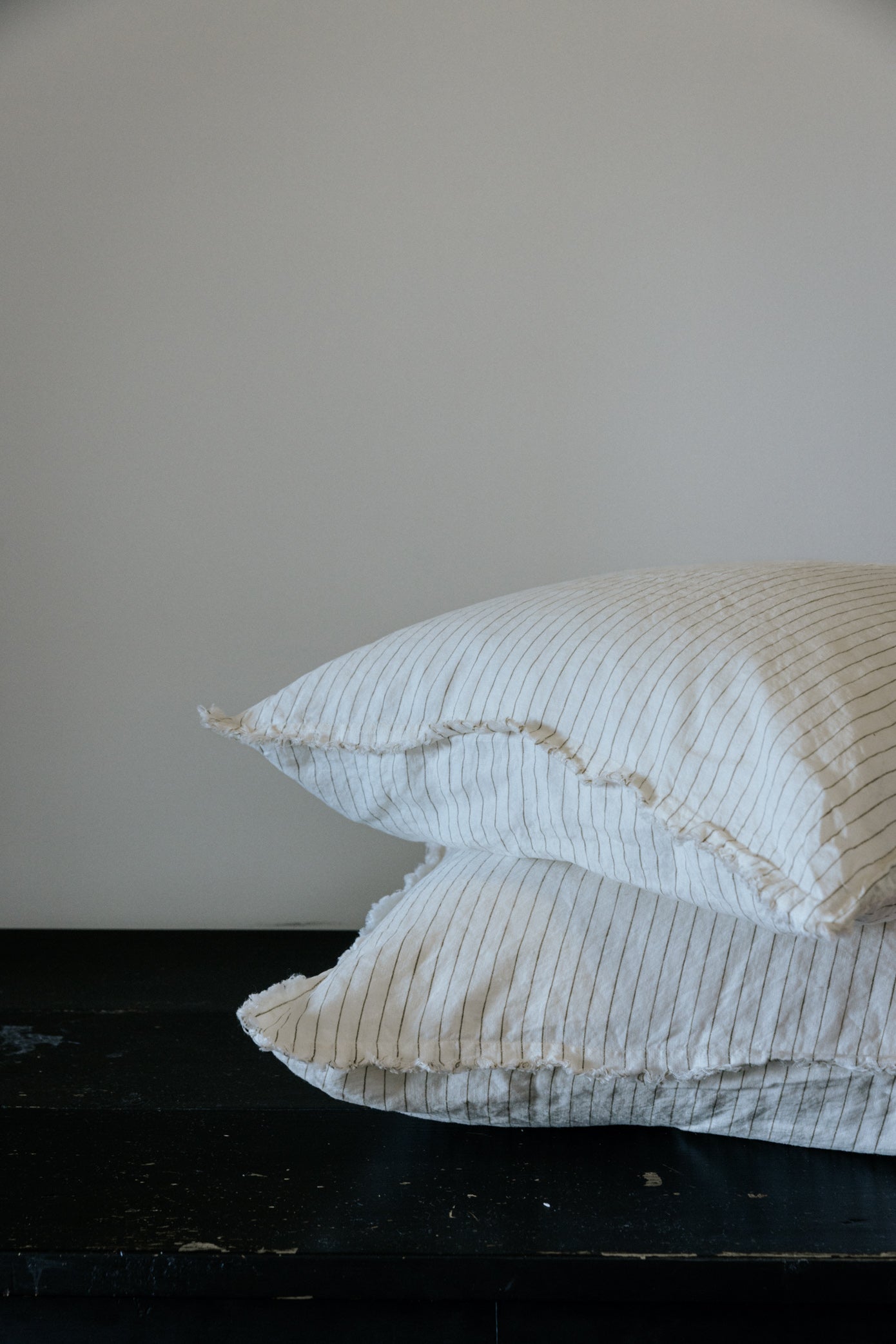 PAIRE DE TAIES D'OREILLER EN LIN EUROPÉEN EFFILOCHÉ À LA MAIN - RAYURES FINES OLIVE