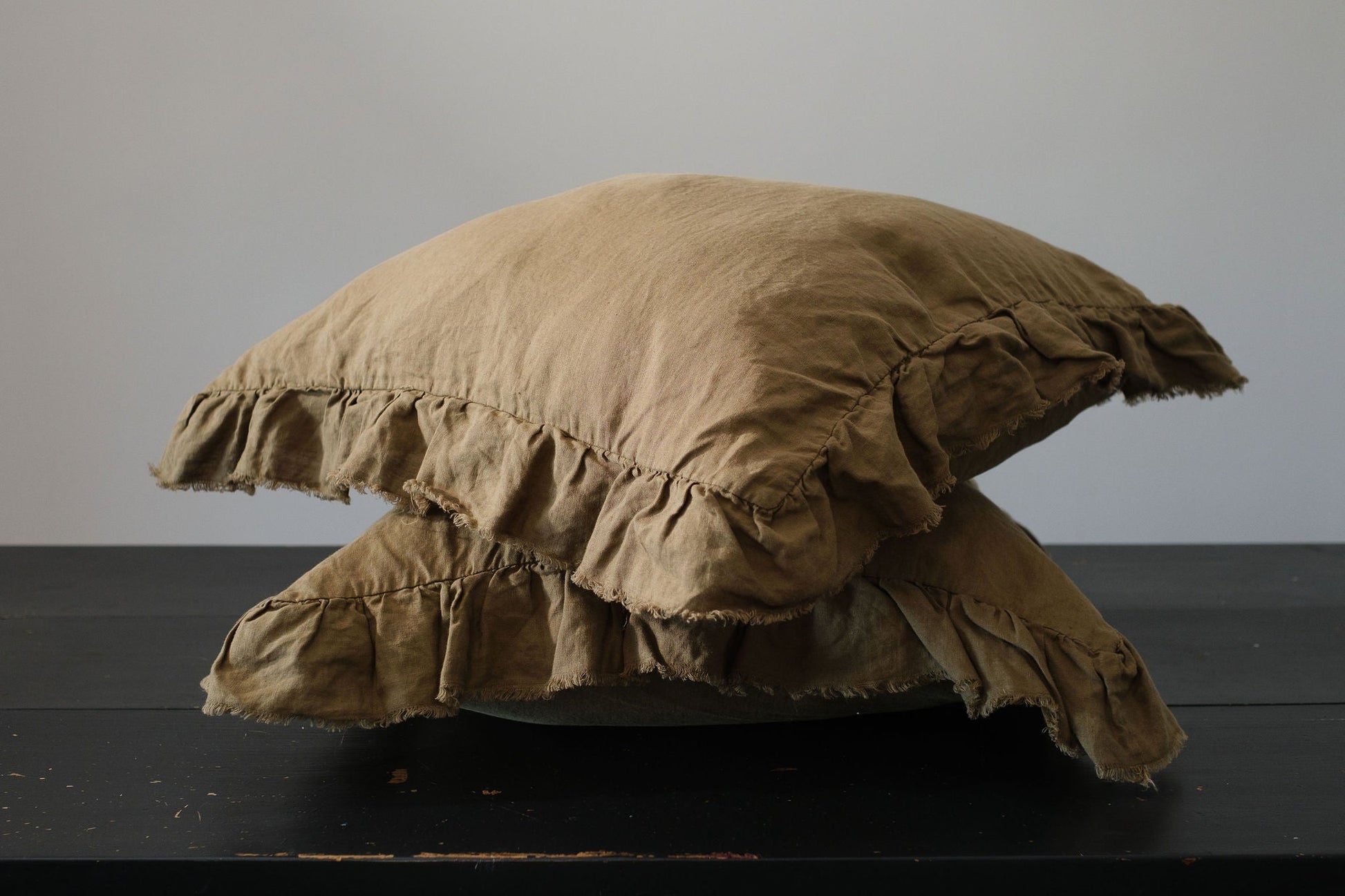 Paire de taies d'oreiller en lin européen à volants - Olive