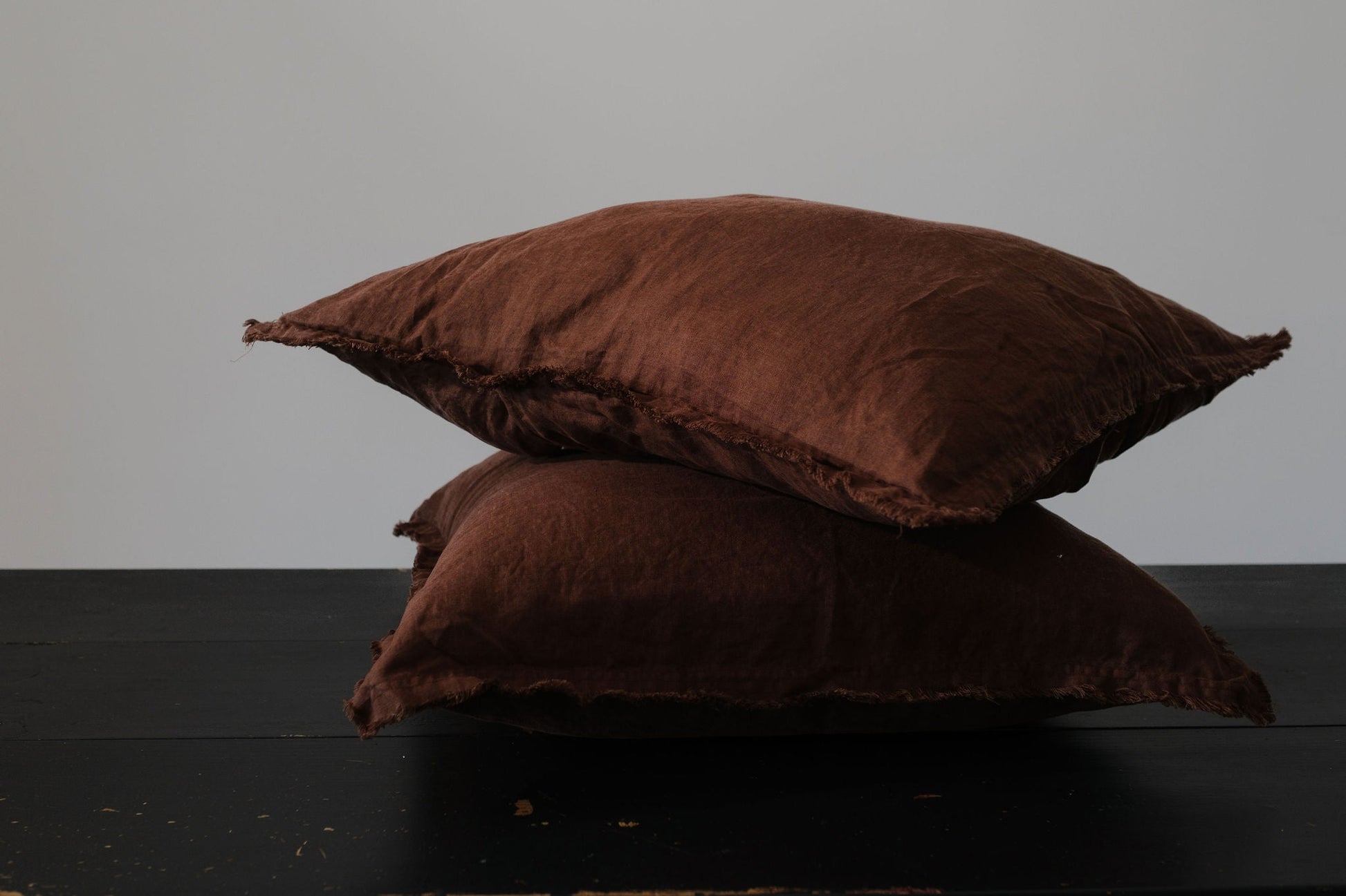 PAIRE DE TAIES D'OREILLER EN LIN EUROPÉEN EFFILOCHÉ À LA MAIN - CACAO
